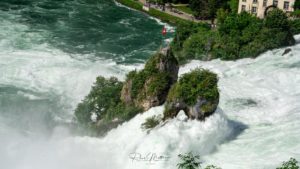 Wir entflohen den Menschenmassen und nahmen das Boot über den Rhein. Die Route an den Felsen in der Mitte war geschlossen, sie fuhren nur etwas Nahe hin damit die Gäste die Kraft des Wassers zu spüren bekamen.